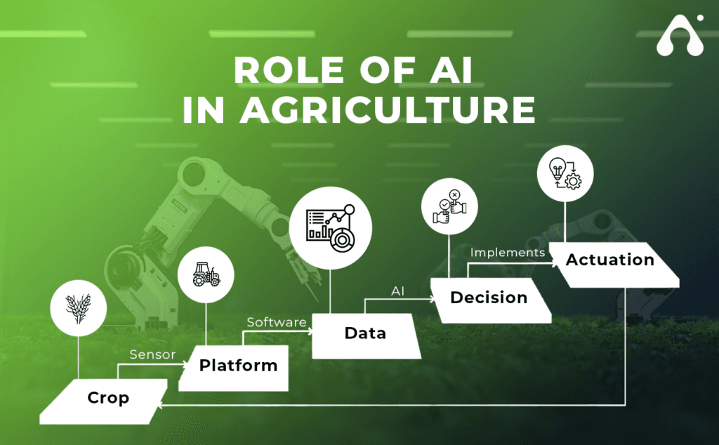 AI analyzes data from weather, soil, and crop health to provide actionable insights for planting, irrigation, pest management, and yield prediction.